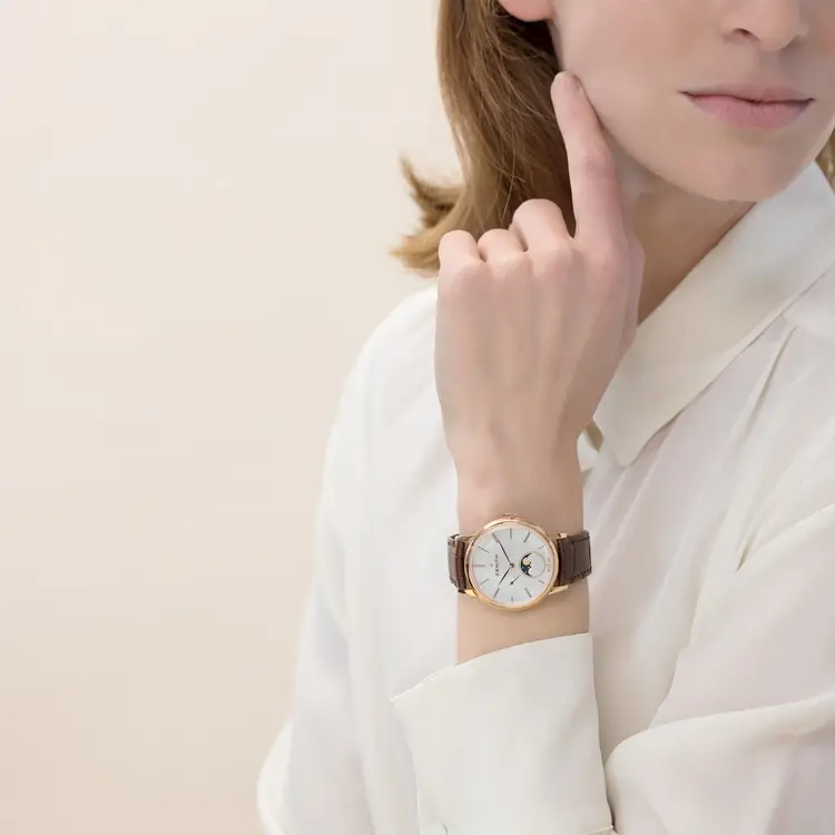 Elite 表款拥有纤薄的表壳、简约设计的简洁表盘以及精巧的细节,例如嵌花刻度、小秒针表盘或月相 表盘。Elite 手表的核心是自制的自动机芯,它以可靠、纤细和运行顺畅而著称。